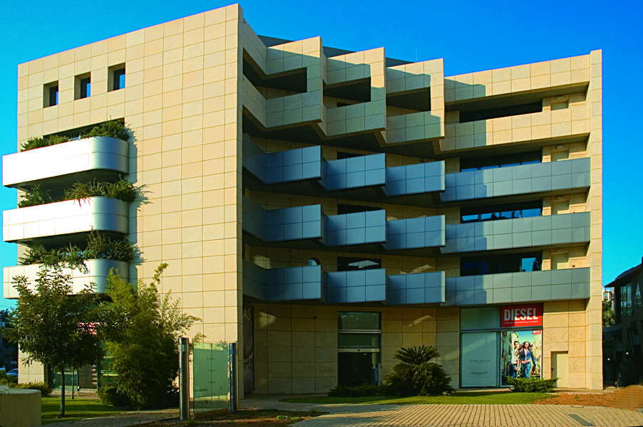 Τα γήινα χρώματα και οι επενδύσεις από μάρμαρο συνδυάζονται άψογα με τις ανά όροφο ζαρντινιέρες επιφάνειας 30τ.μ. και βάθους 1μ. δίνοντας αρμονική και ταυτόχρονα μοντέρνα όψη στα κτίρια.